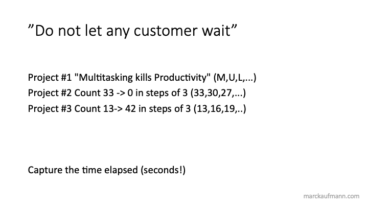 Note that the third project in each round is misconfigured! (You can’t count from 13 to 42 in steps of 3, nor from 36 to 2 in steps of 3). This is rarely pointed out in round #1. When this misconfiguration (=wrong requirement) is identified, it is almost always identified in round #2. This plays nicely into the quality issues when multitasking